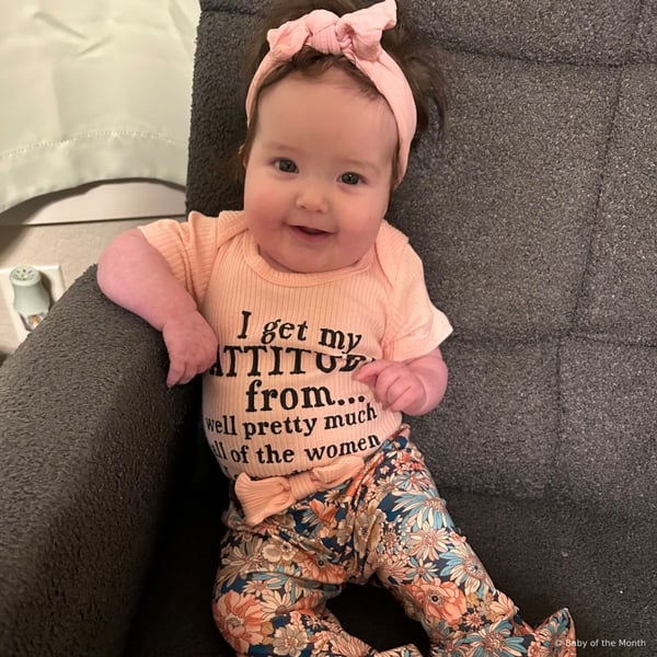 "Claire is 4 months old. She loves tummy time, watching her aquarium, and listening to mommy read. She loves to sit with mom and watch reruns of Little House on the Prairie every Saturday."