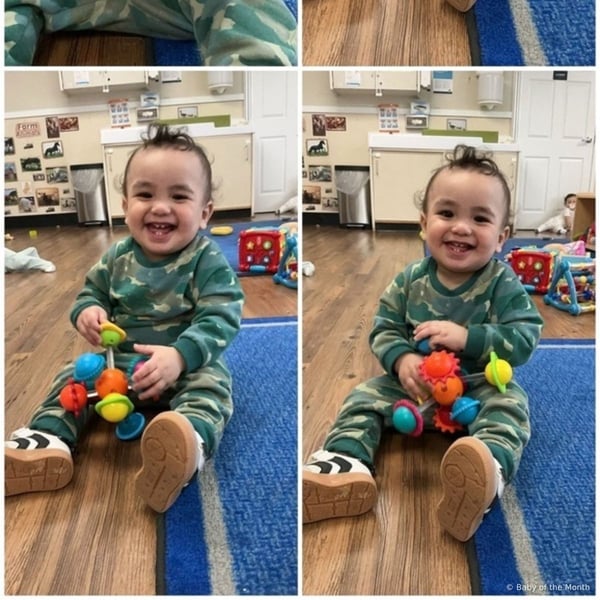 "Our happy baby is always smiling and giggling! He has such a funny personality"